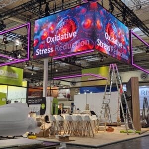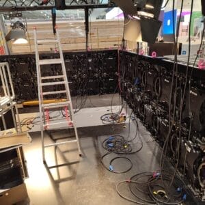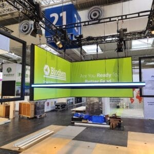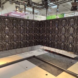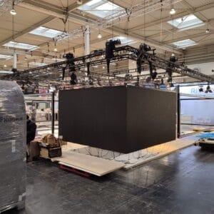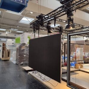 A: Ein Panel wiegt ca. 7,8 kg → 48 Panels = 374 kg reines Screen-Gewicht. Hinzu kommen Rigging, Traversen. Ein Techniker + Gehilfe schaffen die Installation an einem Messetag (ca. 8 Stunden inkl. Justage). Dank Stapelbarkeit und Plug-&-Play-Verkabelung ist der Aufbau sehr effizient. Nach der Veranstaltung bauen wir alles wieder ab.